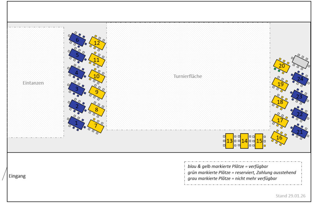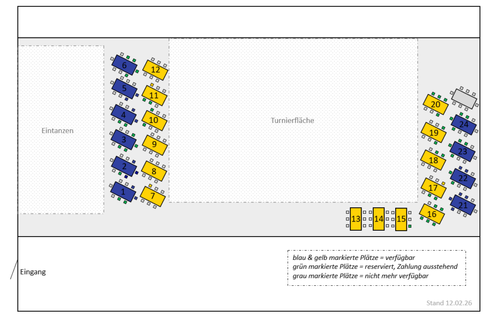 Wir bemühen uns, Tisch- und Sitzplatzwünsche zu berücksichtigen. Ticketanfragen werden chronologisch bearbeitet. Nicht mehr verfügbare Plätze werden im Saalplan grau angezeigt, reservierte Plätze (ausstehende Zahlung) grün. Blau und gelb markierte Plätze sind weiterhin verfügbar. Der Saalplan wird ab Verkaufsbeginn regelmäßig aktualisiert.